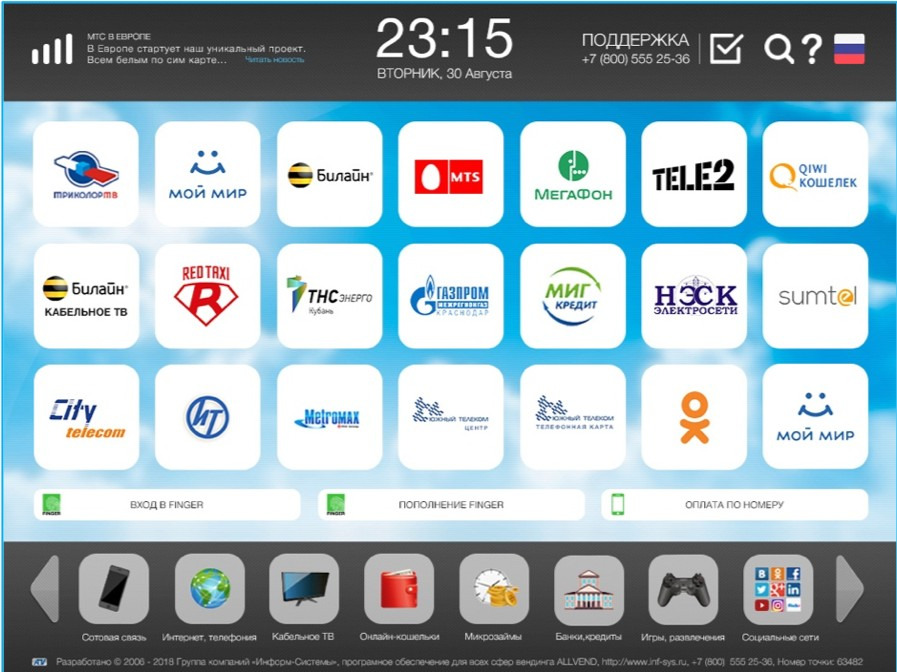 | Описание: | Система SkySend представляет программное обеспечение для платежных терминалов, которое обладает рядом отличительных преимуществ: 1. Современный дизайн, анимированный интерфейс 2. Оплата услуг по QR-коду 3. Интеллектуальная сортировка кнопок оплаты по территориальному признаку и частоте поступления платежей 4. Автоматическое определение оператора связи по введенному номеру телефона 5. Возможность создавать индивидуальные дизайны экранов 6. Автоматическое исправление ошибок в работе купюроприемника и принтера, восстановление интернет-соединения без вмешательства технического специалиста. ПО Системы SkySend запускается и работает с флеш-накопителя, который содержит операционную систему и программное обеспечение терминала. ПО автоматически определяет все устройства, благодаря чему его запуск терминала в работу занимает 15 минут! Перевод терминалов на работу с Системой SkySend осуществляется БЕСПЛАТНО. Узнайте все подробности по телефону +7 (800) 555-25-36 или отправив письмо с темой "ПО терминалов нового поколения" на электронную почту sales@inf-sys.ru |